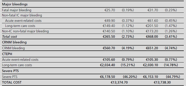 The model considered different utilities according to the different health states, A baseline utility of 0.82525 was accepted for patients with VTE without a previous history of complications. The development of intracranial haemorrhage or CTEPH was associated with utilities of 0.33026 and 0.65027, respectively.
