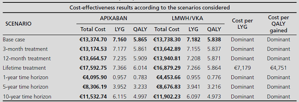 Apixaban was dominant in the base case, and in almost all the alternative scenarios. When considering a lifetime treatment, there was an additional incremental cost per and QALY gained of €7,179 and €4,751, and apixaban appear to be a cost-effective option vs. LMWH/ VKA based on the cost-effectiveness thresholds presented in scientific literature (€30,000 to €45,000 / QALY)39,40.