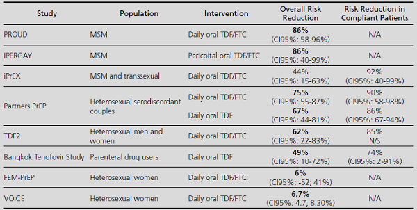 A detailed analysis of the studies points at lack of compliance as the main cause for the differences in outcomes found. Thus, PrEP becomes a highly effective strategy when patients reach high compliance rates, particularly among MSM; therefore, compliance of the prescribed dosing is the weak link of PrEP as a prevention strategy. The development of prolonged-release injectable agents can help to improve this aspect in future studies9.