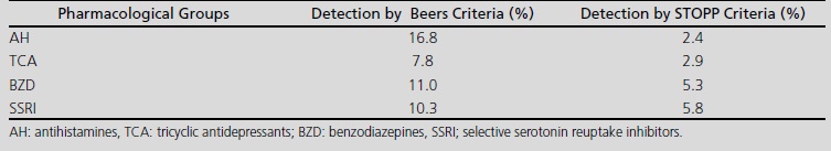 Tricyclic antidepressants are no longer first-line drugs for elderly people due to their high potential of causing adverse effects. However, these drugs are still frequently prescribed. In our study, these drugs represented 7.7 and 2.9% of PIPs detected by the Beers and STOPP Criteria, respectively, being quite similar to the results found by other authors whose PIPs for this group range between 7.1 and 7.7%, according to Beers Criteria, and between 1.5 and 4.1% according to STOPP12,16,20. The reason for this difference in prevalence is that Beers Criteria contraindicate the use of tricyclic antidepressants per se (doxepin, amitriptyline and imipramine) regardless of diagnosis and clinical setting, whereas the STOPP Criteria only state certain scenarios in which these drugs should not be used (dementia, glaucoma, altered cardiac conduction and constipation), being therefore more flexible and allowing a higher selection in prescription5.