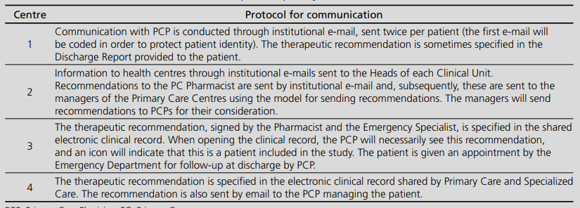 The intervention consisted in the implementation of an interprofessional collaboration program between Hospital Pharmacists, Emergency physicians and Primary Care Physicians. The Pharmacist reviewed the treatment previous to the visit of the patient to the Emergency Department, assessing its adequacy to the STOPP-START criteria15. PIPs were identified according to these criteria, and this was communicated to the Emergency Physician involved in the study. If the visit to the Emergency Department was related with the PIP, the emergency physician, could modified the patient´s chronic treatment in the Emergency Discharge Report. In case the PIP was not corrected in the Emergency Report, the Primary Care Physician was informed once the patient had been discharged, with a recommendation to re-evaluate the treatment and follow the recommendations. Each participant centre determined its protocol of communication with Primary Care. The protocol was approved by the management of each centre (Table 1).