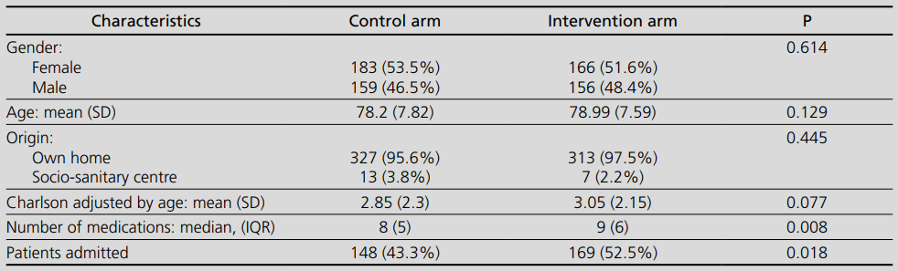 The study is currently conducted in four centres, and the inclusion period has been completed. In total, 666 patients have been included; one of them was excluded before conducting the intervention, because he had already been previously included, Out of the remaining 665 patients, 342 patients were randomly assigned to the control arm, and 323 to the intervention arm. The characteristics of the patients included are detailed in table 2.