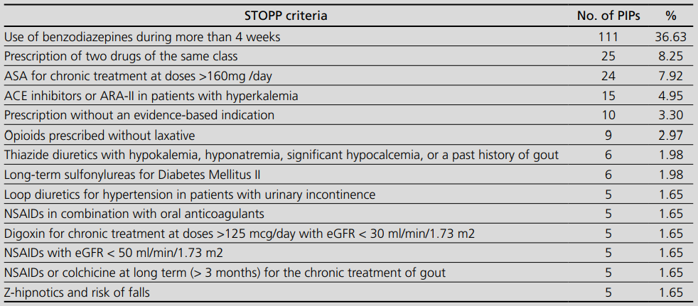 A number of explicit criteria have been developed to identify PIP. Beers Criteria have been the most widely mentioned in international geriatric literature, but their drawback is that they include a high proportion of drugs not marketed in Europe14. The STOPP-START criteria have been introduced more recently, and their clinical development has been conducted by the European Union Geriatric Medicine Society15. This is a tool that identifies potentially inadequate medication (STOPP criteria) as well as potential omissions of medications (START criteria). STOPP-START criteria have been more strongly associated with the development of adverse reactions than Beers criteria16. Therefore, in recent years the STOPP-START criteria have been positioned as the method for PIP detection in our setting.