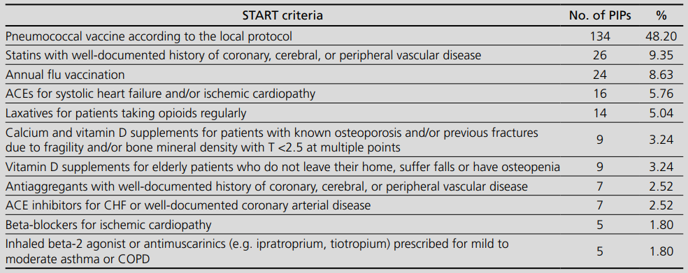 Regarding START criteria, the higher number of PIPs is due to the lack of anti pneumococcal vaccination according to the local protocol; but this could be due to the recent launch of the conjugated vaccine at the time of patient inclusion, and a reduction over time is expected. Another finding was the high frequency of the lack of use of statins in patients with vascular disease, as well as of ACE inhibitors in patients with heart failure. These results are similar to those reported by other authors22,23.