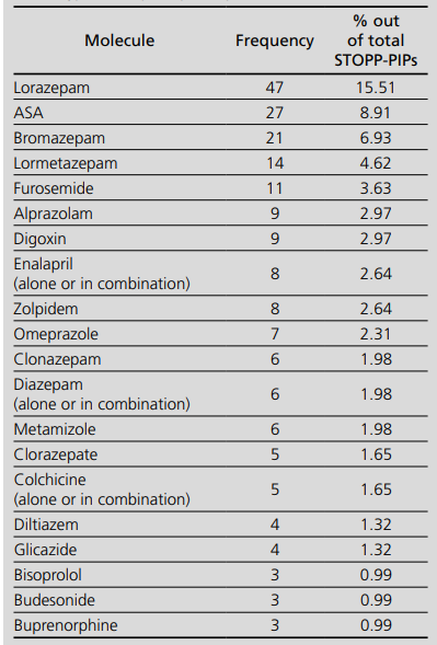 The description of the most frequent types of PIPs is detailed in tables 3 and 4. The majority of STOPP-type PIPs consisted in the inadequate use of benzodiazepines, followed by the use of antiaggregant drugs. The molecules more frequently involved in STOPP-type PIPs are described in table 5. Regarding START-type PIPs, the most frequent was lack of compliance with anti pneumococcal vaccination.