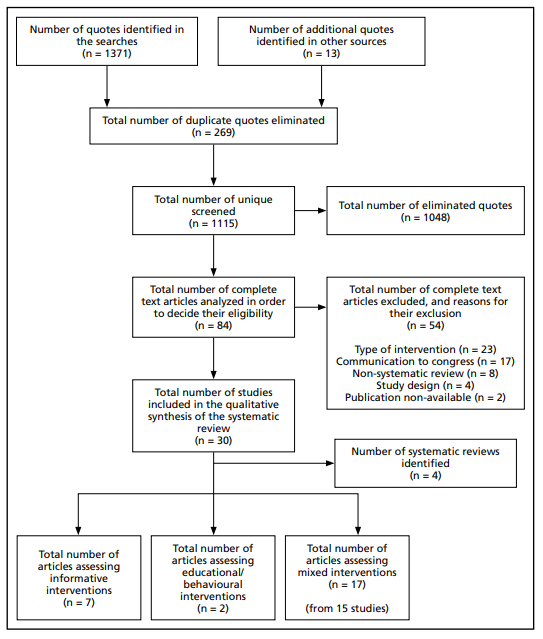 A total of 1,115 single quotes were identified based on the search strategy (Fig. 1), while 84 articles were considered potentially relevant based on the review of title and abstract. The complete text of these articles was then reviewed. After applying the eligibility criteria, 30 articles were selected which, after review, were classified as publications assessing: informative interventions (n=7), educational or behavioural interventions (n=2) or mixed interventions (n=17, belonging to 15 studies). Four (4) systematic reviews of evidence were also included.