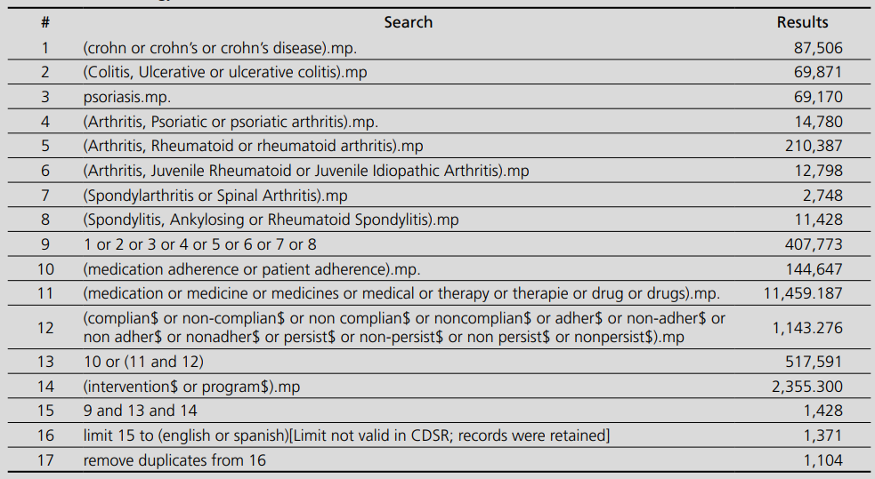 Firstly, a systematic review was conducted of the interventions for improving treatment adherence in inflammatory conditions, which was used as the basis for preparing the initial recommendations. The search was started on March, 24th, 2013, without any time limitations, in the following databases: EBM Reviews, Cochrane Database of Systematic Reviews (2005 to March 2013), Embase (1988 to 2013, week 16) and MedLine through the OVID platform (1946 until the current day). The search strategy in order to identify all relevant studies included terms associated with the conditions studied, adherence and persistence, and was limited to studies published in English and Spanish (Table 1). Studies were considered eligible if: (i) they included patients with a confirmed diagnosis of an inflammatory condition (Rheumatoid Arthritis, Polyarticular Juvenile Idiopathic Arthritis, Axial Spondyloarthritis, Ankylosing Spondylitis, Psoriatic Arthritis, Psoriasis, Crohn’s Disease, and Ulcerative Colitis) under drug treatment; (ii) there was an assessment of any intervention or method used for improving drug treatment adherence; and (iii) they presented a comparative or non-comparative experimental design, including observational studies or systematic reviews. The following were excluded: non-systematic bibliographic reviews, editorials and opinion articles, as well as presentations to congresses. Two independent reviewers selected the studies according to previously defined criteria, in two structured stages of reading the title and abstract (1) and the complete text (2). Discrepancies were sorted out by consensus.