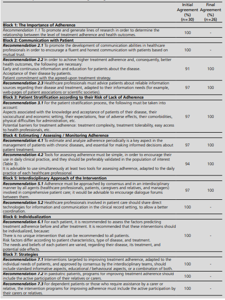 Literature review resulted in an initial list of 8 recommendations based on evidence, which was discussed and modified at each of the three expert meetings, thus reaching a preliminary list of recommendations with an Expert Level of Evidence in the majority of cases. This preliminary list of recommendations was distributed into 7 blocks that describe the process of assessment for treatment adherence: the importance of adherence, communication with patients, patient stratification according to their risk of non-adherence, estimating/assessing/monitoring adherence, interdisciplinary approach of the intervention, individualization, and strategies in order to improve adherence. The individual voting through electronic questionnaire showed a very high level of agreement among experts. From the 14 recommendations submitted to vote, the experts showed a unanimous level of agreement for 7, and for the remaining 7, only 1 to 3 experts declared to be partially in disagreement. The latter were reviewed, modified, and a consensus was reached in the final meeting, with a unanimous vote (Table 2). Each one of the 14 final recommendations are detailed below, divided into blocks, as well as their justification according to the level of evidence for each one: