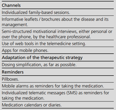 Interventions targeted to improving treatment adherence, adapted to the individual needs of patients, and approved by consensus by the interdisciplinary teams, should include standard informative aspects, educational / behavioural aspects, or a combination of both.