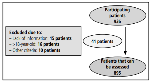 An observational, longitudinal and retrospective study was conducted in a cohort of 936 patients with paediatric spasticity treated with Botox® or Dysport®, between December, 1995 and October, 2012, at the Paediatric Neurology Unit of a first-level Spanish hospital. From the total number of patients registered, 895 were adequate for assessment according to selection criteria (Figure 1): Spastic patients