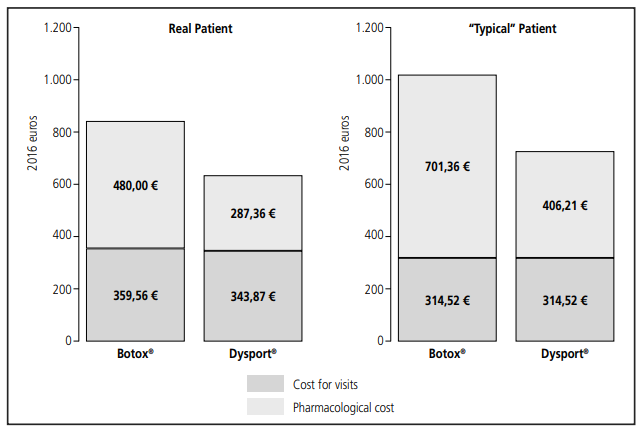 Finally, if the “typical patient” profile is considered, the potential pharmacological savings with Dysport® would be 295,15€ per patient and year (Table 3 and Figure 2), and the annual direct cost would be 1.015,88€ for Botox® and 720,73€ for Dysport®.