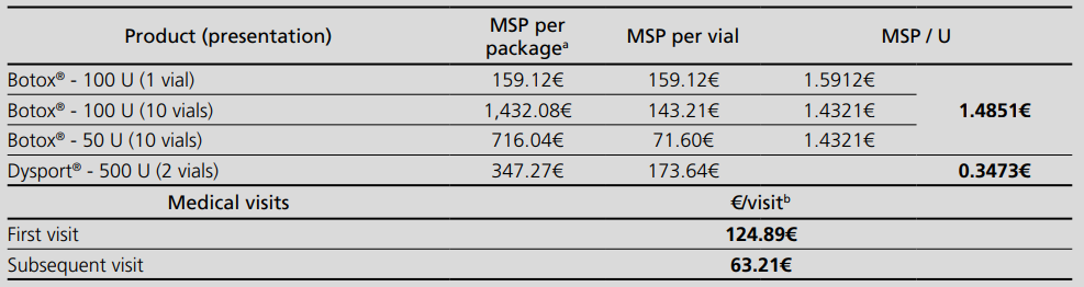 The analysis was conducted from the perspective of the National Health System (NHS), considering direct costs only: pharmacological costs (manufacturer’s selling price)14 and costs of visits15 in 2016 euros. The unit costs of Botox® and Dysport® correspond to the mean of the different formulations (Table 1).