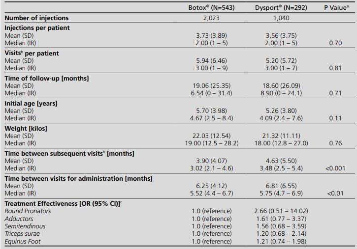 Different studies show that both treatments are very similar in terms of effectiveness and safety18-23 as long as they are adequately administered23-26. However, due to the fact that the TBA concentration is not the same in both products27, toxins are not comparable. Besides, the dilution and injection techniques lead to a greater alteration in these disparities. There is also a significant variation in doses depending on the specific preparation used, the muscle injected, disease severity, and treatment duration28. The main contribution by this study is that its data source was a real record of Spanish patients with Pae diatric Spasticity. Therefore, its results correspond to real clinical practice in the treatment of spasticity with TBA.