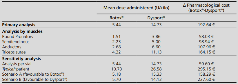 Finally, a hypothetical scenario was assumed, with the profile of a “typical patient”, whose cost was calculated for a mean weight of 22 kilos and four visits per year (two of them with drug administration) for both patient groups, and assuming injection in each one of the four muscle groups with the mean dose observed in the sample.