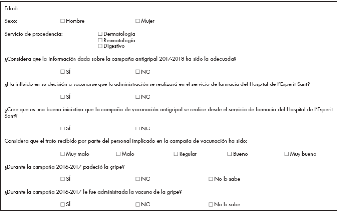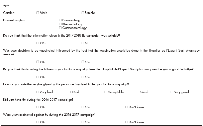 At the time of vaccination, each patient filled in a questionnaire to assess their level of satisfaction with the influenza campaign (see Appendix 1Figura 1). During the months of April and May 2018, a phone call was made to all those patients who through the eCAP program had not known if they had contracted flu during the 2017/2018 campaign.