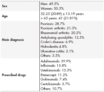 A total of 188 patients gave their consent to participate in the study, of which 49.5% were men and 50.5% women. The mean age of participants were 52.5 ± 13.19 years. The main diagnoses of the patients were psoria sis (28.7%), psoriatic arthritis (21.3%), and rheumatoid arthritis (20.2%). In to tal, 97.34% of patients had already started BT. The most common treatments received were adalimumab (39.9%), infliximab (13.8%), and ustekimumab (13.3%) (Table 1).