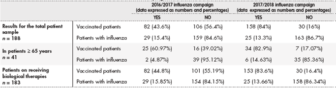Method: A 15-month quasi-experimental study of patients starting or receiving treatment with biological therapies. Between October and De cember 2016 and October and December 2017, we compared influenza vaccination rates, the incidence of influenza in the study population, the direct impact of the vaccination campaign on the patient, the effect of the campaign on vaccination rates, and the results of the satisfaction survey.
