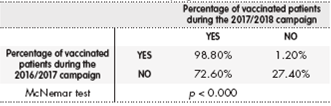 Of the patients who had not been vaccinated during the 2016/2017 campaign, 72.6% were vaccinated during the 2017/2018 campaign (p < 0.000) (Table 3). No statistically significant differences were found between the 2016/2017 and 2017/2018 campaign (p = 0.636) in the percentage of patients who contracted flu after receiving the vaccine.