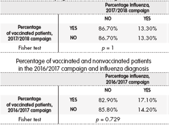 During the 2017/2018 campaign, the percentages of vaccinated and nonvaccinated patients who contracted flu was the same (13.3% and 13.3%; p = 1). The percentages were similar during 2016/2017 campaign (14.2% and 17.1%; p = 0.729) (Table 4).
