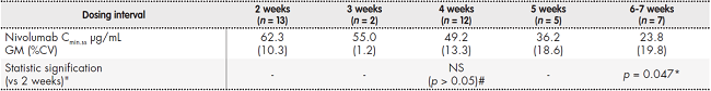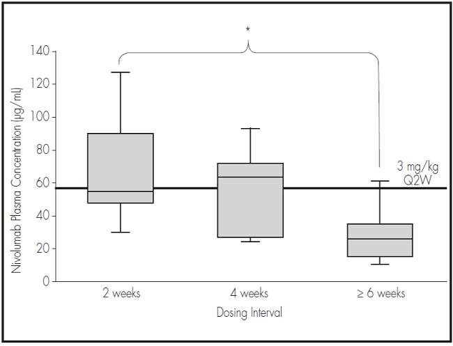 Resultados: Se analizaron muestras de 19 pacientes que recibieron inicialmente 3 mg/kg de nivolumab cada dos semanas. Se analizó un total de 39 muestras, entre los ciclos 6 y 27. La pauta habitual se modificó, una vez alcanzado el estado de equilibrio, en 12/19 (60%) pacientes, en los que se amplió el intervalo a 3, 4, 5, 6 o 7 semanas. No se encontraron diferencias estadísticamente significativas al comparar la administración cada dos semanas y cada cuatro semanas. Cuando los intervalos fueron de seis o siete semanas, la concentración sérica media mostró una diferencia estadísticamente significativa en comparación con la administración cada dos semanas.