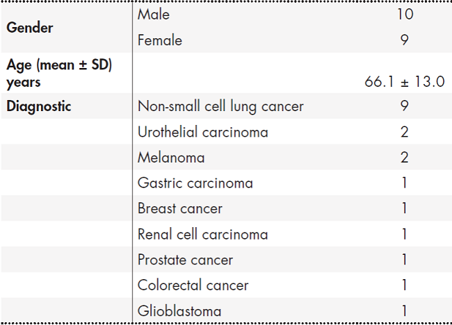 During the study period, the pharmacokinetic profile of nivolumab in 19 patients with solid tumors who received 3 mg/kg Q2W was analyzed. Eligible patients had predominantly NSCLC but also other diagnoses as shown in Table 1.