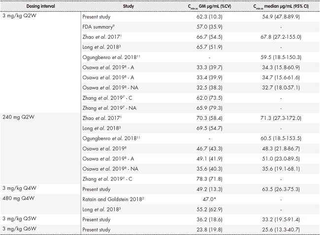 exposure for the 480 mg Q4W schedule simulated in 3,817 patients across multiple tumor types with those for the 3 mg/kg Q2W and 240 mg Q2W schedules3 or in other recently published series1,2,15 as shown comparatively in Table 3. Most of the patients included were diagnosed of NSCLC and the CV observed has been low in comparison with those reported in previous works in the same context, probably due to the limited size of the analyzed sample.