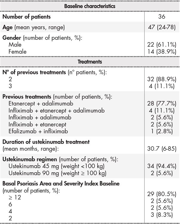 A total of 36 patients were included. The majority were men (61.1%). In most cases, ustekinumab was the third biologic drug patients received after they had previously been treated with treatment of two anti-TNF-α drugs (88.9%). However, the study also included patients receiving ustekinumab as the fourth biologic drug (11.1%). Prior to ustekinumab, the two most frequently used biologic drugs were infliximab (34 patients, 94.4%) and etanercept (33 patients, 91.7%). Almost 95% of patients received the ustekinumab 45-mg regimen. The baseline PASI value for over 80% of the patients was equal to or more than 12. Table 1 shows the patients’ baseline characteristics and prior treatments.