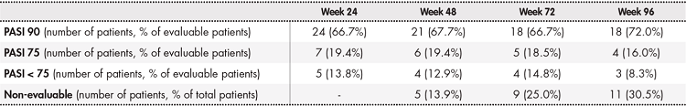 Table 2 shows the effectiveness data for ustekinumab. At weeks 24, 48, 72 and 96, at least 66.7% of the patients reached PASI 90 and between 19.4% and 16.0% of patients reached PASI 75. The percentage of non-evaluable patients increased over time, and reached 30.5% of the total by week 96. One patient was non-evaluable due to temporary withdrawal of ustekinumab at weeks 72 and 96 because of pregnancy. The remaining non-evaluable patients had shorter follow-up than that required by the corresponding effectiveness metrics.