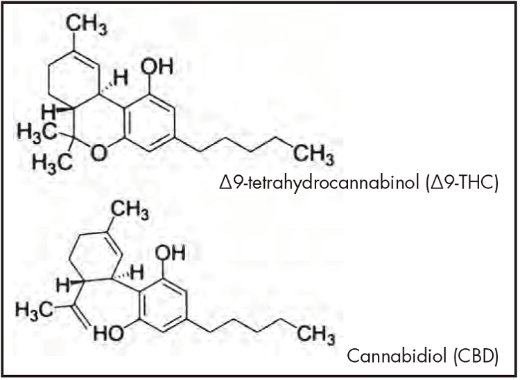 G protein-coupled receptors, nowadays known as CB1 and CB2, differ in the biological processes they are involved and in their anatomic distribution. CB1 receptors predominate in the central and peripheral nervous systems and are less active in other tissues such as the spleen, the tonsils, the gastrointestinal tract, the uterus, the prostate and the adrenal glands. In contrast, CB2 receptors are found mainly in the immune system and are less represented in the central and peripheral nervous systems and the gastrointestinal tract13-15. The roles of these receptors are also different: while CB1 receptors are involved in the central regulation of food intake, response to novelty and stress, addictive behavior, regulation of hepatic and gastrointestinal activity, smell and cardiovascular activity, CB2 receptors play a role in immune regulation, neurodegeneration and, to a lesser extent, in the processing of reward and addictive behavior16. THC exerts its main psychoactive effects mediated by CB1 receptors1.
