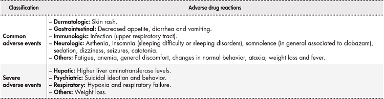 Patients with refractory epilepsy often receive multiple drugs, which often leads to the development of several drug-drug interactions. Also, given that CBD is a substrate and inhibitor of several cytochrome P450 enzymes, the occurrence of drug-drug interactions is expected53-58. Until now, the interaction of CBD with CLB presents the highest evidence in in vitro and in vivo studies64,65,67. Such pharmacokinetic interactions results in increased CLB metabolite levels. The most frequent ADRs associated to CBD were either mild or moderate, and included somnolence, mainly due to concomitant administration of CLB, and gastrointestinal disturbances. In addition, liver function abnormalities were observed in association with the use of valproic acid. Severe ADRs were scarce5,6,8,9.