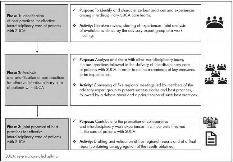 A literature review was carried out using the following search terms: “severe uncontrolled asthma,” “interdisciplinary team,” and “hospital pharmacy.” Each expert team provided a thorough description of the interdisciplinary care model implemented in their hospital and shared their views on the best practices presented by fellow group members, as well as on any barriers to their implementation by their hospital or any improvements that could be made to them. Best practices were compiled and distributed into five domains across all three phases of the project: 1) Work dynamics in interdisciplinary SUCA teams. 2) Diagnosis and classification of SUCA cases. 3) Therapeutic planning and access to biologic therapies in SUCA. 4) Patient education and adherence to treatment in SUCA. 5) Training and research into SUCA.