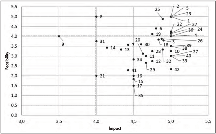 High impact and feasibility (mean score ≥ 3.5 for both impact and feasibility).