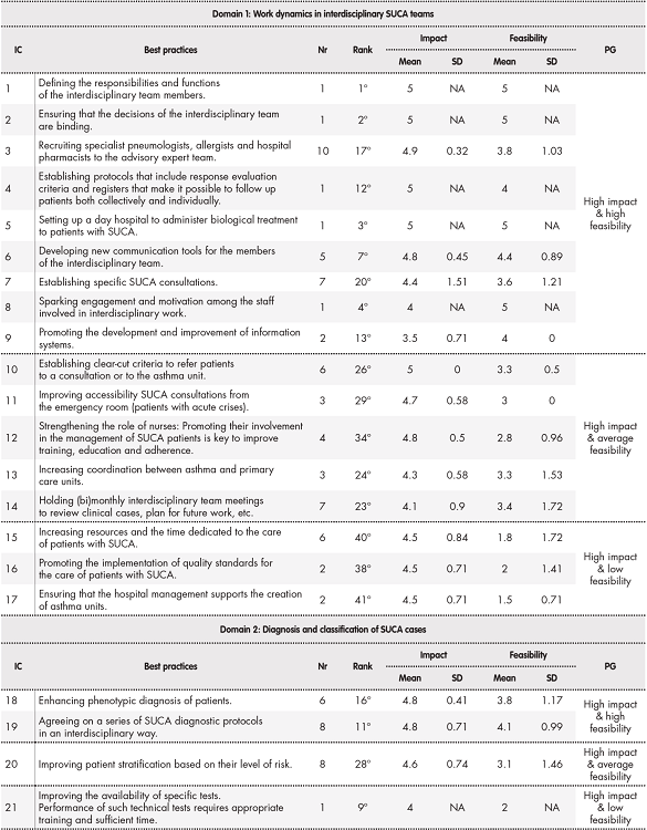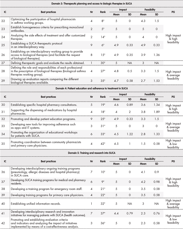 In phase 2, a total of 95 health care providers (44% of them specialist hospital pharmacists, 31% specialist pneumologists and 25% specialist allergists) from 48 hospitals in five autonomous regions worked together to extend the initial list of best practices to 42 different initiatives related to the interdisciplinary care of patients with SUCA. Over half of these best practices (52%) fell into the high impact/high feasibility category. Seven of the initiatives identified (16.7%) belonged to the high impact/low feasibility category. Table 1, Table 1 cont provides the full list of best practices, together with their distribution into the different domains and the mean score assigned to each of them in terms of their impact and feasibility.