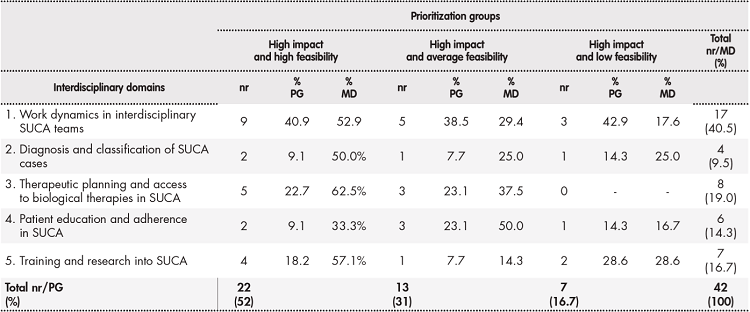Most best practices (40.9%) regarded as high impact/high feasibility corresponded to the work dynamics in interdisciplinary SUCA teams domain. It must be noted that none of the best practices in the therapeutic planning and access to biological therapies in SUCA domain was considered low feasibility; initiatives in this area were considered both necessary and easily implementable with the collaboration of hospital pharmacy units. Table 2 shows the prioritization of best practices across different areas, as a function of their potential impact and feasibility.