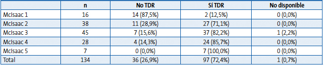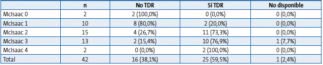 En los 42 niños < 3 años, se solicitó TDR al 59,5%. Aunque a esta edad el consenso1 no especifica que se utilicen criterios de McIsaac, se decidió emplear dicha escala para conocer en qué casos se pidió TDR (Tabla 2). Se solicitó TDR a un 83,3% de los niños con una puntuación ≥ 2.