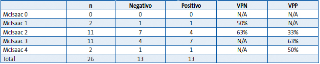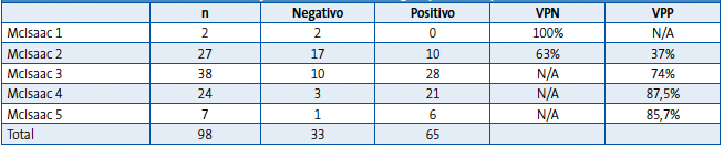 Teniendo en cuenta el resultado microbiológico positivo (TDR o cultivo), se relacionó con la escala de McIsaac (Tabla 3 y Tabla 4). Puede comprobarse como ningún corte en la puntuación de McIsaac ofrece resultados aceptables para tomar la decisión de iniciar antibioterapia teniendo en cuenta datos clínicos, tal y como el consenso1 recomienda no hacer.