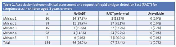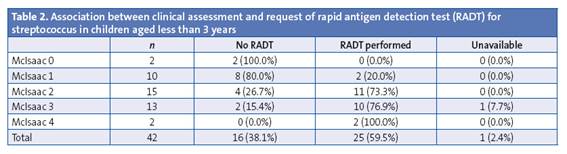 En los 42 niños < 3 años, se solicitó TDR al 59,5%. Aunque a esta edad el consenso1 no especifica que se utilicen criterios de McIsaac, se decidió emplear dicha escala para conocer en qué casos se pidió TDR (Tabla 2). Se solicitó TDR a un 83,3% de los niños con una puntuación ≥ 2.