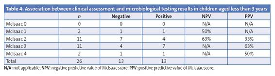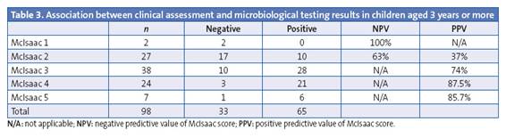 Teniendo en cuenta el resultado microbiológico positivo (TDR o cultivo), se relacionó con la escala de McIsaac (Tabla 3 y Tabla 4). Puede comprobarse como ningún corte en la puntuación de McIsaac ofrece resultados aceptables para tomar la decisión de iniciar antibioterapia teniendo en cuenta datos clínicos, tal y como el consenso1 recomienda no hacer.