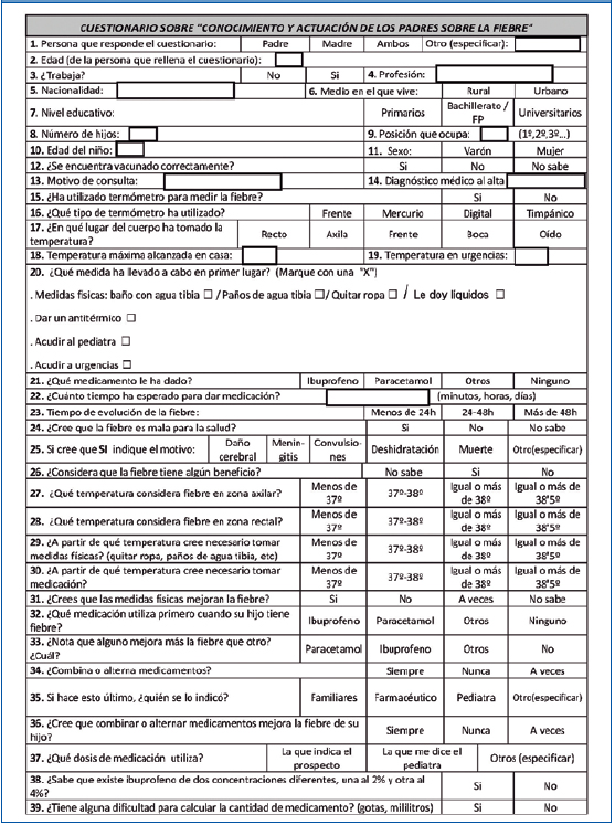 La obtención de los datos se realizó mediante una encuesta estructurada con 39 ítems y varios niveles de respuesta, compuesta tanto por preguntas abiertas como cerradas, donde se recogieron datos sociodemográficos, nivel educativo, estatus socioeconómico, conocimiento y actitudes acerca de la fiebre y otros ítems de relevancia para el estudio (Fig. 1). La muestra fue obtenida entre aquellas personas que dieron su consentimiento para participar en el estudio. Para su cumplimentación fue habilitada la sala de triaje del Servicio de Urgencias.
