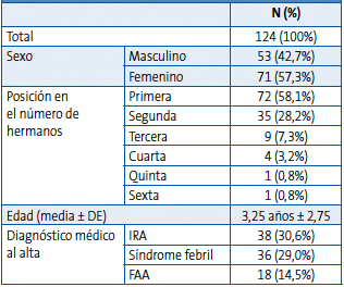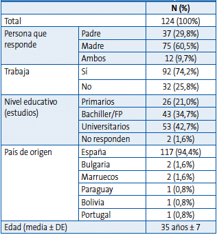 En el presente estudio fueron evaluadas 124 encuestas. Se reflejan en las tablas el perfil de la persona acompañante (Tabla 1) y las características de los niños que acuden por fiebre al Servicio de Urgencias (Tabla 2).