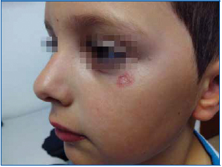 Se manifiesta como lesiones redondeadas u ovaladas (una o más), rojizas, planas, bien delimitadas, que se extienden por los bordes, dejando una zona central descamativa y bordes sobreelevados papulovesiculosos (Fig. 1). En ocasiones son discretamente pruriginosas.