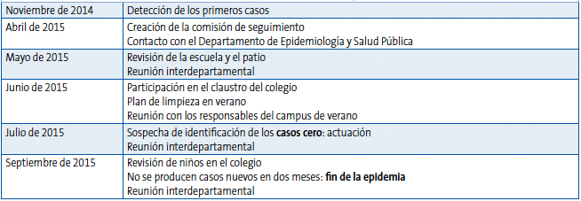 La alarma familiar, escolar, social y sanitaria llevó a la creación de una comisión de seguimiento entre el Departamento de Epidemiología y Salud Pública y el Departamento de Educación de la provincia, con interrelación permanente con los profesionales sanitarios implicados y la dirección del centro. Esta comisión, con un protocolo de actuación y un seguimiento minucioso de los casos, así como la relación multidisciplinar entre los estamentos afectados (colegio, Salud Pública, Atención Primaria), fueron fundamentales para controlar la epidemia.