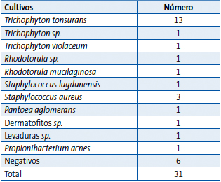Se recogieron 31 cultivos, de los cuales seis fueron negativos y en 25 (80,6% de los cultivos recogidos) sí crecieron gérmenes. De los cultivos positivos, 13 lo fueron a Trichophyton tonsurans (41,9% del total de los cultivos realizados), uno a Trichophyton sp., uno a Trichophytum violaceum, uno a Rhodotorula sp., uno a Staphylococcus lugdunensis, tres a Staphylococcus aureus, uno a Rhodotorula mucilaginosa, uno a Pantoea agglomerans, uno a dermatofitos sp., uno a levaduras sp., y uno a Propionibacterium acnes (Tabla 2).