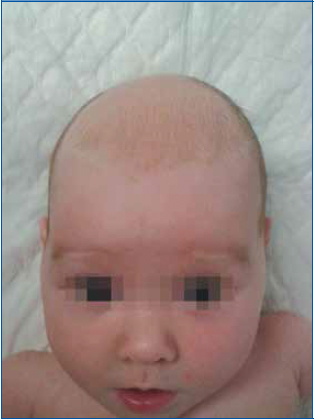 Niña de un mes y medio de edad que es remitida a la consulta de Pediatría por un riñón derecho pélvico y un mechón blanco de pelo en la región frontal (Figs. 1 y 2).