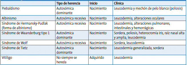 El diagnóstico diferencial se debe hacer con otras entidades que cursan con falta de pigmentación de la piel (Tabla 1), de las que se diferencia porque aquellas presentan otra sintomatología, además de la cutánea.