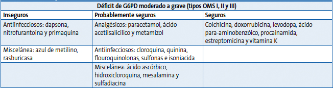 Cuando se contacta con algún estresante y hay déficit, la anemia hemolítica aguda puede iniciarse desde horas hasta tres días después de haber sufrido el estrés oxidativo. Finaliza cuando se han hemolizado todos los eritrocitos deficientes de G6PD y se han sintetizado nuevos con actividad enzimática, a los cuatro y siete días. La oxidación puede ser causada por infecciones, acidosis diabética, consumo de habas o fármacos oxidantes. Los agentes oxidantes más importantes son algunos fármacos. Algunos están muy bien estudiados (Tabla 1); sin embargo, en otros, como los anestésicos, sobre todo los anestésicos locales, hay lagunas de importantes de conocimiento (Tabla 2)4.