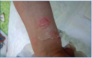 Niña de tres años, sin antecedentes patológicos de interés, que acude a su centro de salud por una quemadura en antebrazo derecho. Refieren un contacto accidental con SuperGlue(r), con el que estaban intentando arreglar una pulsera que tenía puesta. Trataron de retirar el pegamento con agua y jabón. Al parecer, se le quedó adherido el borde de la manga de la prenda que llevaba y tiraron para quitársela, con lo que desprendieron parte de la piel. En la Fig. 1 se observan restos de pegamento en la muñeca, en forma de brazalete, y una zona adyacente de pérdida de sustancia de 1,5 cm de diámetro. Fue tratada en el centro de salud durante tres semanas, respondiendo bien a las curas con Linitul(r) y pomada de nitrofurazona.