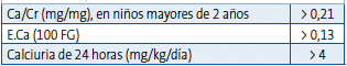 Se define la hipercalciuria como la excreción urinaria de calcio superior a 4 mg/kg/día con una dieta normal en calcio, proteínas y sodio. En la práctica clínica se utiliza habitualmente la relación calcio/creatinina (Ca/Cr) medida en una orina aislada, de forma que, por encima de los dos años, una relación superior a 0,2 sugiere hipercalciuria. En menores, el límite es mayor, llegando a ser de 0,8 entre 0 y 6 meses y de 0,6 entre los 7 y los 24 meses, sobre todo en los alimentados con leche materna.