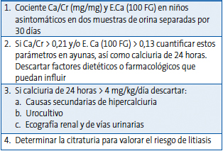Se debe descartar hipercalciuria ante la presencia de hematuria (macroscópica indolora o microhematuria mantenida), infecciones urinarias de repetición, polaquiuria, urgencia miccional, enuresis, cólico nefrítico, urolitiasis, dolor abdominal crónico y osteopenia.