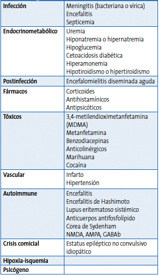 Las alteraciones neuropsiquiátricas de comienzo agudo constituyen un problema de manejo en la edad pediátrica, con un diagnóstico diferencial difícil tras una primera sospecha clínica. Estos procesos se describen en niños sanos que de forma brusca manifiestan clínica diversa, como movimientos anormales, tics, trastorno obsesivo compulsivo y otros síntomas conductuales. Las causas asociadas a estos trastornos neuropsiquiátricos son variadas: infecciosas, postinfecciosas, autoinmunes, metabólicas, traumáticas, psicógenas...